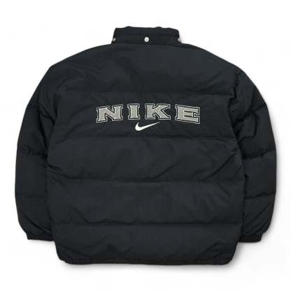 Seltene Nike Pufferjacke aus den 90ern mit gro?em gesticktem ?NIKE�� Spellout auf dem R��cken und klassischem Swoosh auf der Brust. Warm gef��ttert, ikonischer Schnitt �C perfekt f��r den Y2K-Look oder als Statement-Piece im Alltag.