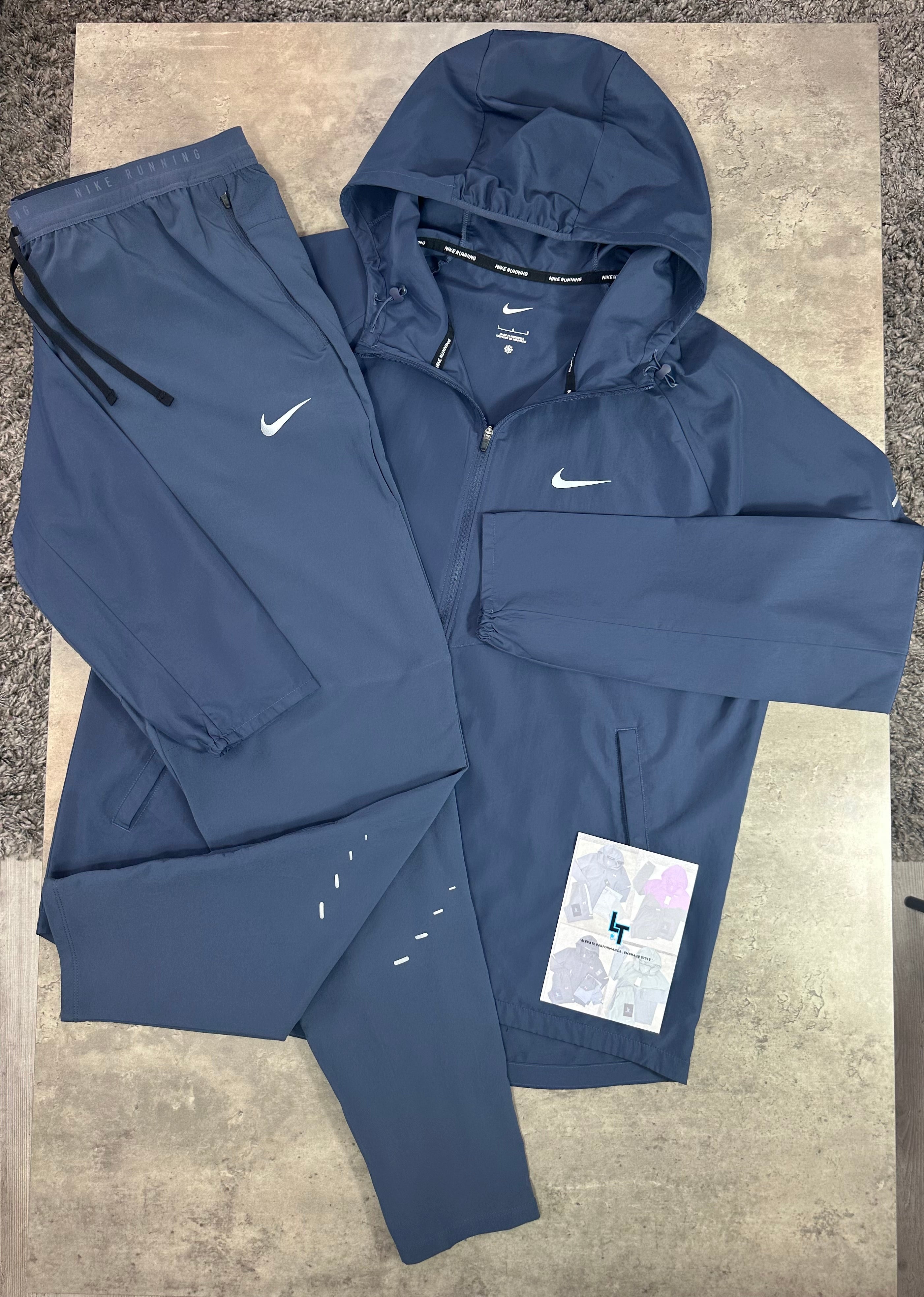 The Nike Repel Stride Tracksuit in Thunder Blue features an updated Miler Jacket designed to withstand wet conditions with its water-repellent fabric and protective hood. Its packable design seamlessly blends functionality with Nike’s classic style. The matching trousers are optimized for movement, featuring streamlined seams that minimize chafing and secure pockets to keep essentials safe. Together, this tracksuit delivers reliable weather protection and enhanced comfort for serious runners.