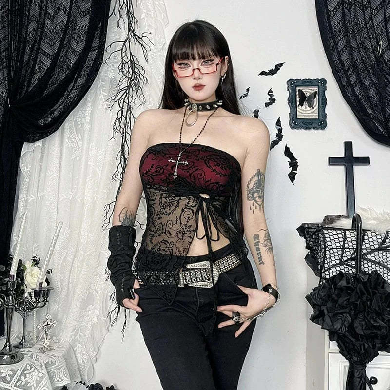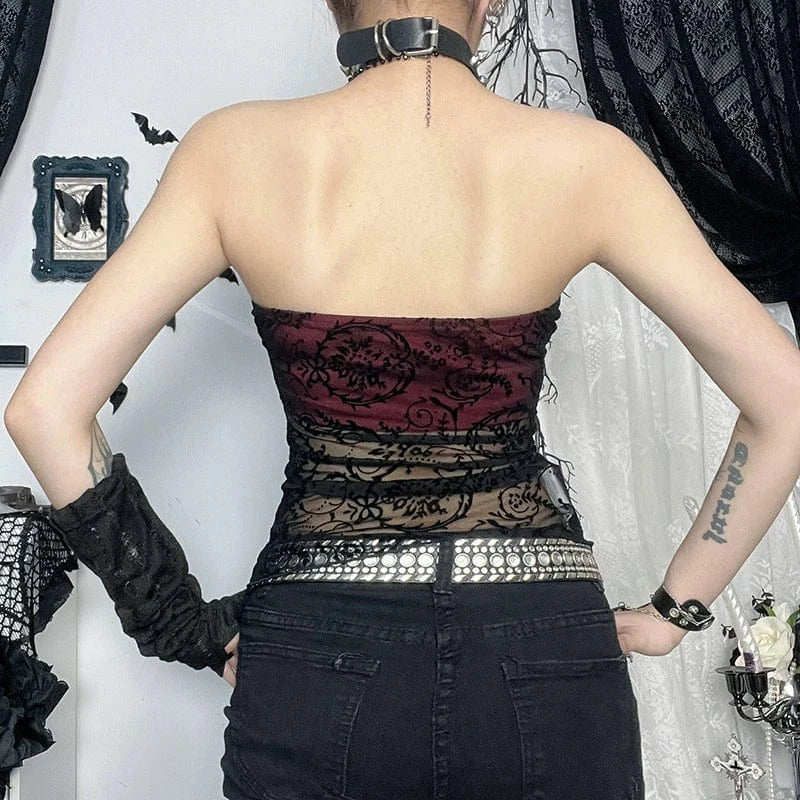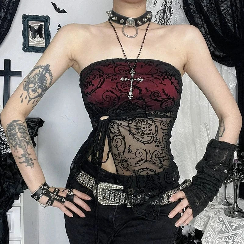 Women's Gothic Drawstring Flocking Mesh Bustier
